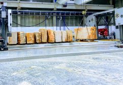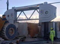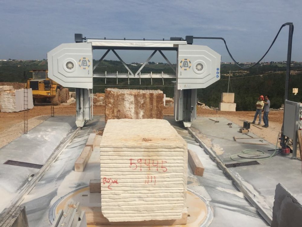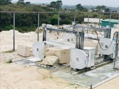 Máquina de corte por cabo de segmentos diamantados, construída em aço estrutural totalmente metalizado e pintado.